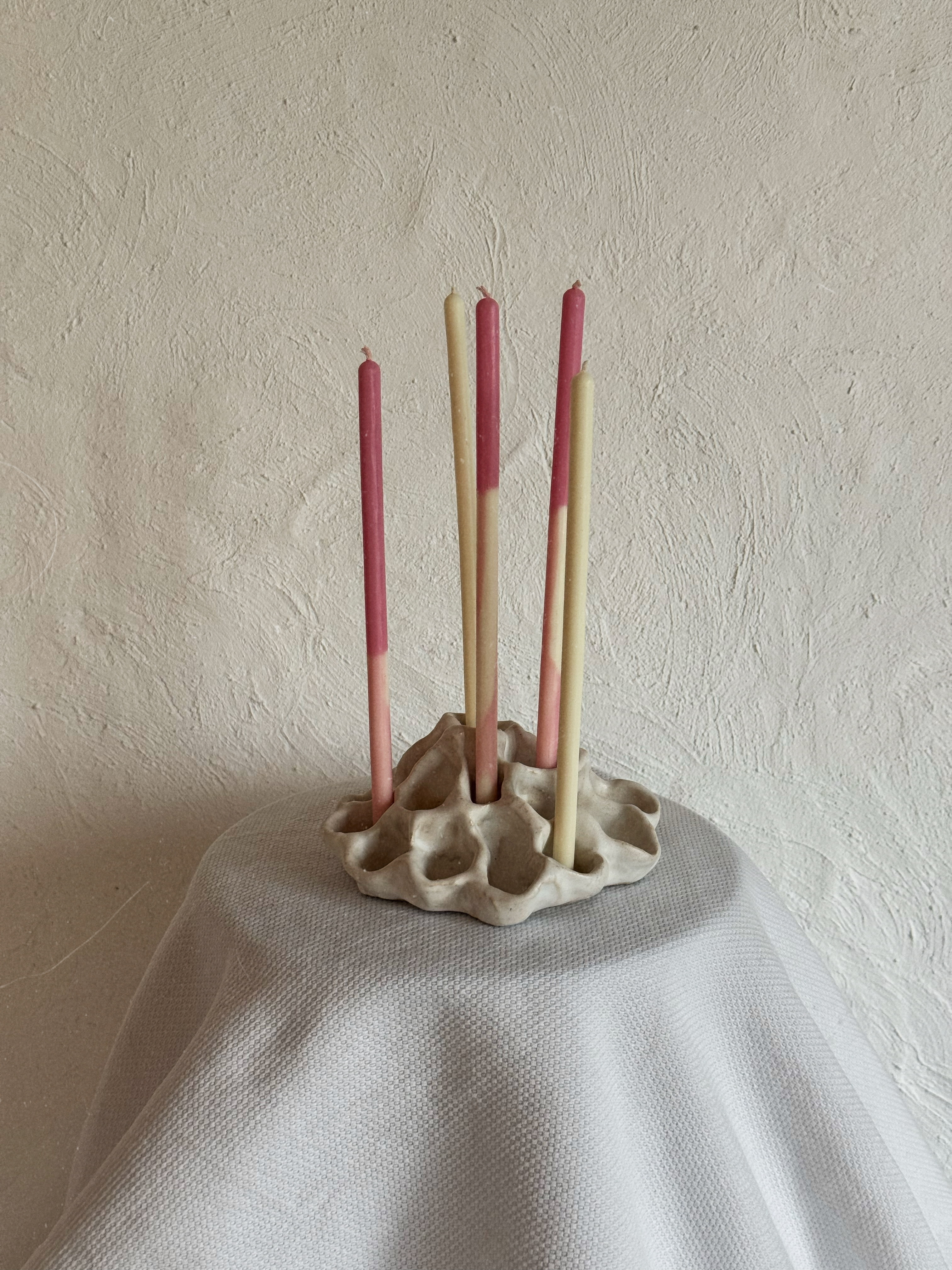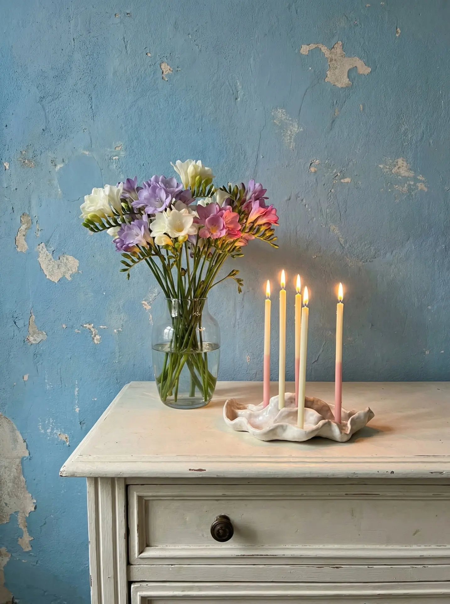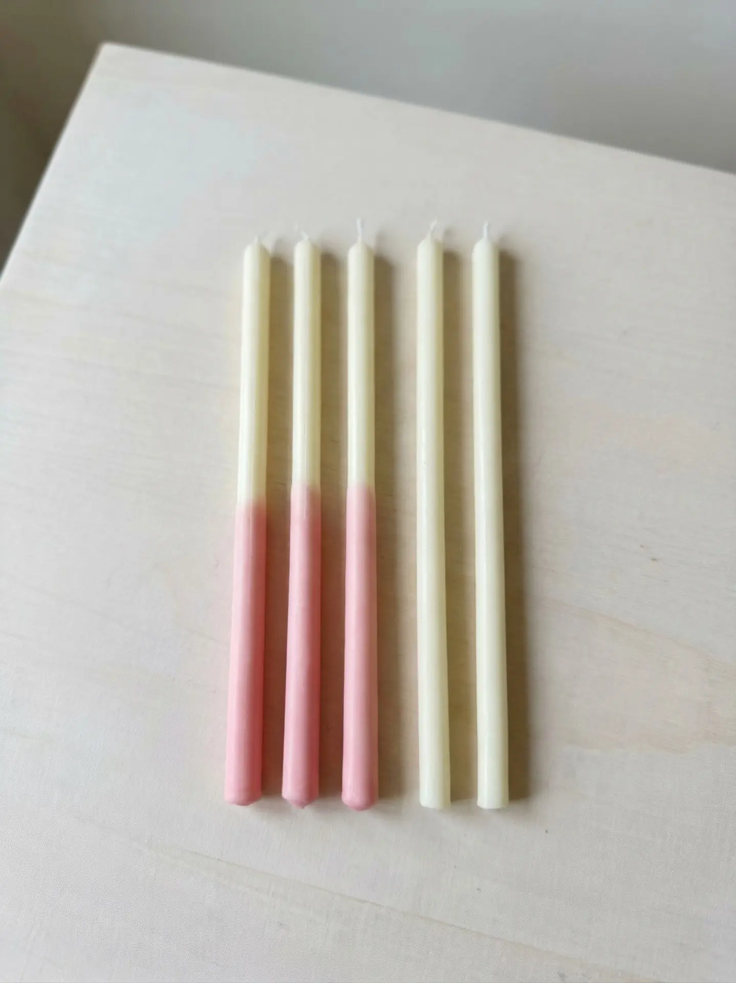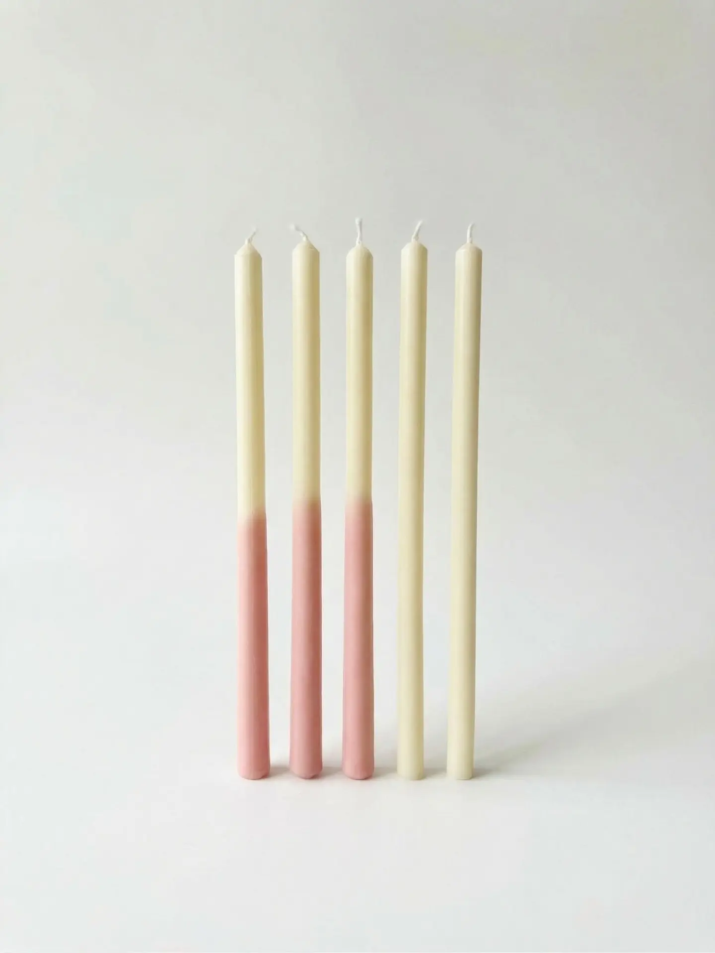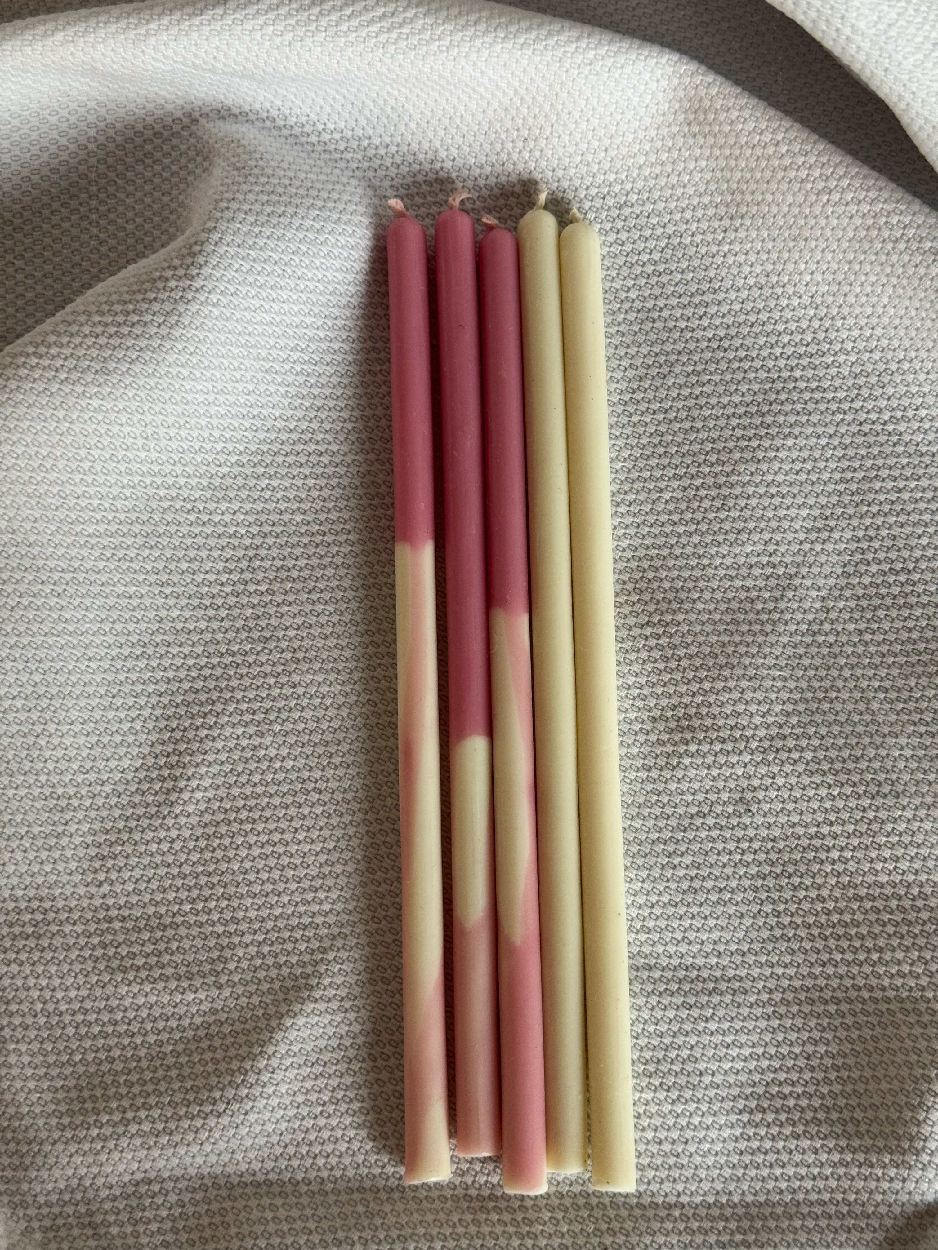Набор изящных свечей, состоящий из двух моносвечей и трёх двухцветных свечей. Свечи предназначены для сервировки стола, создания уюта и тёплой атмосферы. Загаданные желания при задувании этих свечей сбываются. Время горения ~ 1 час